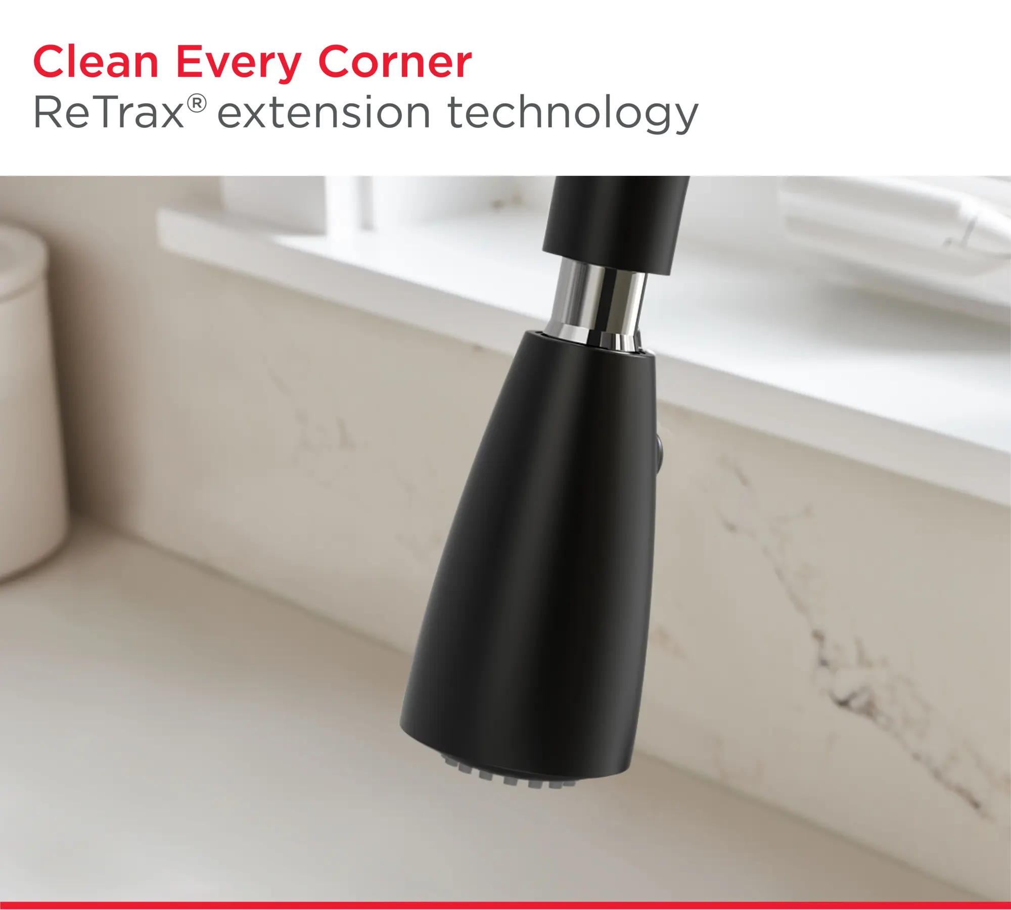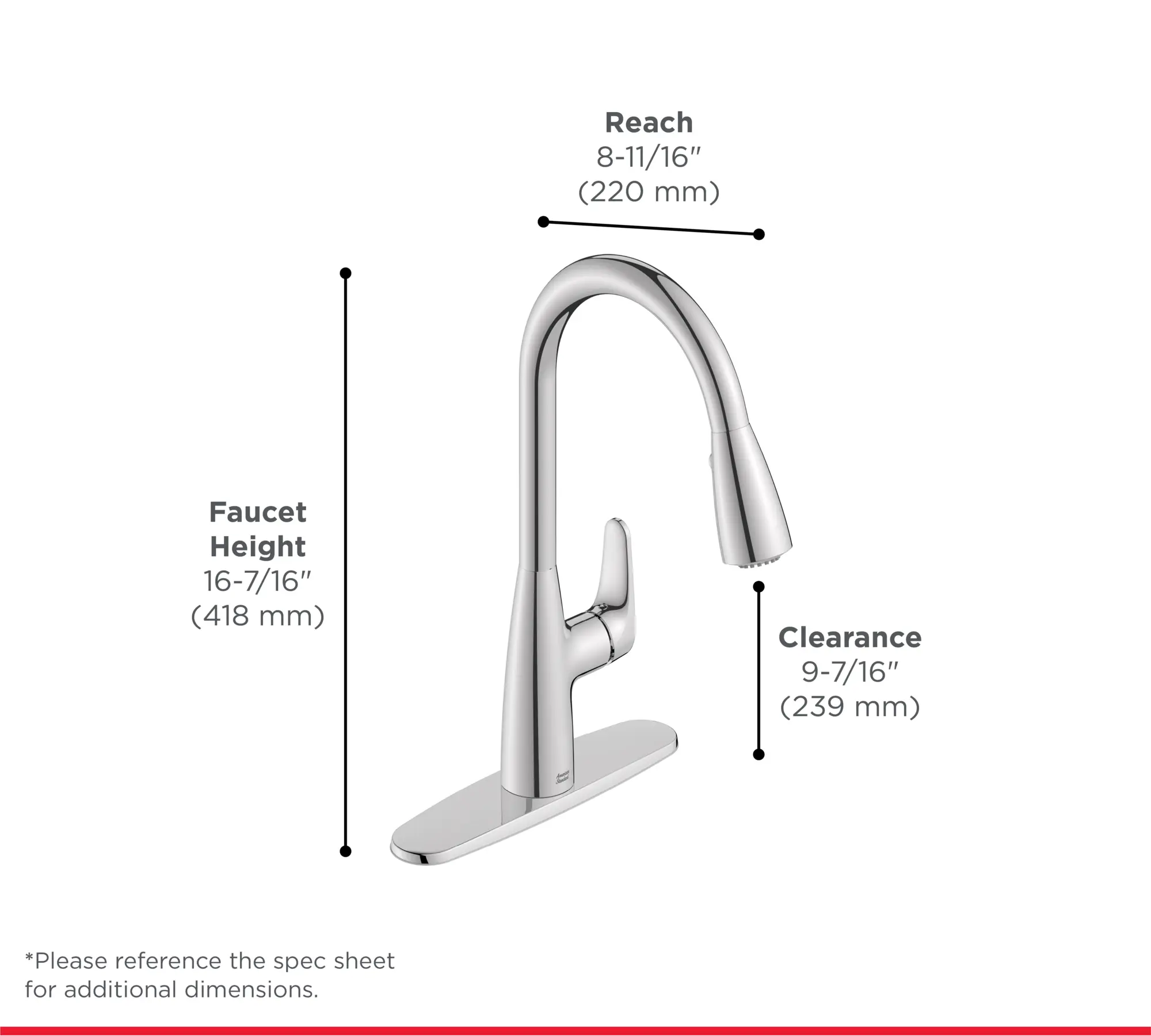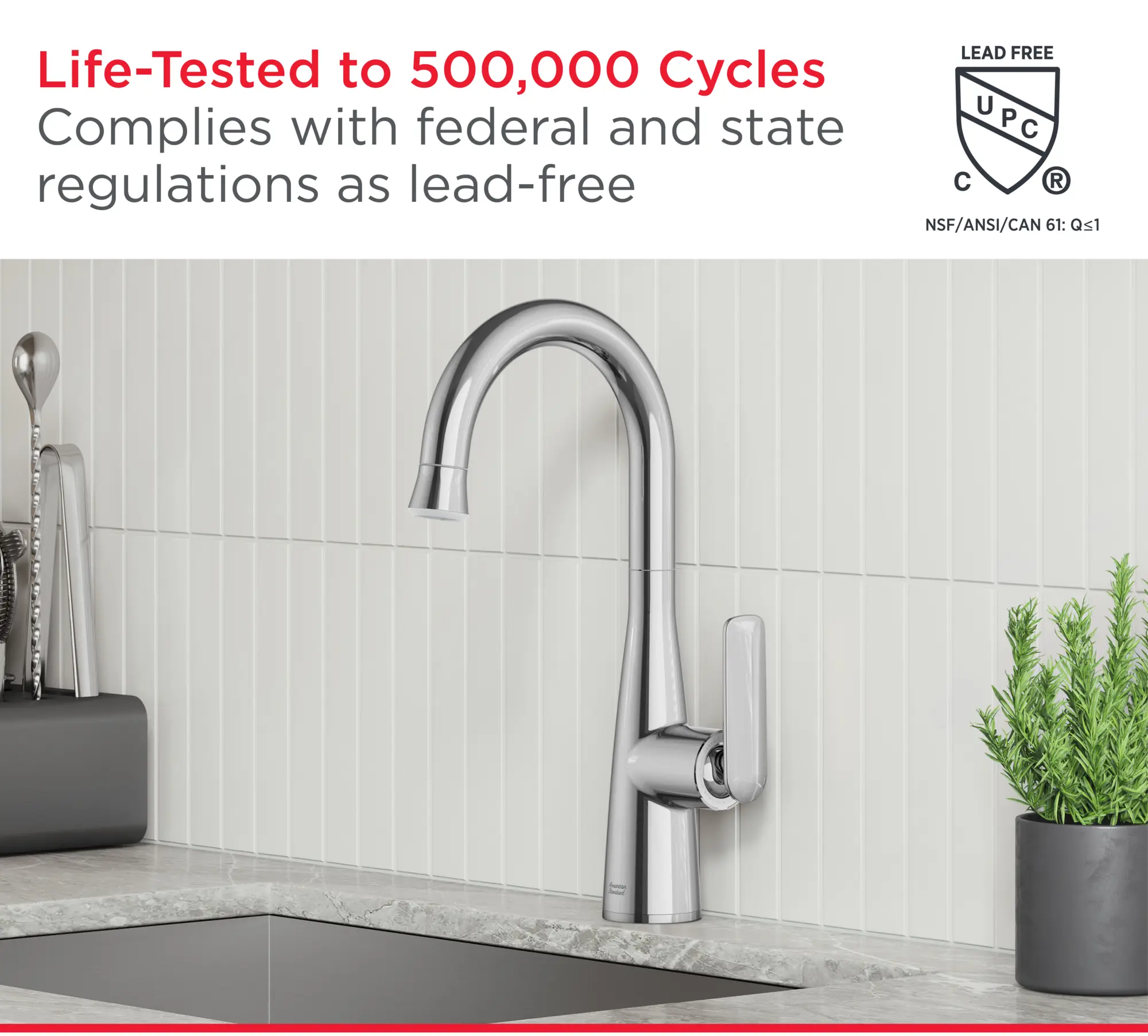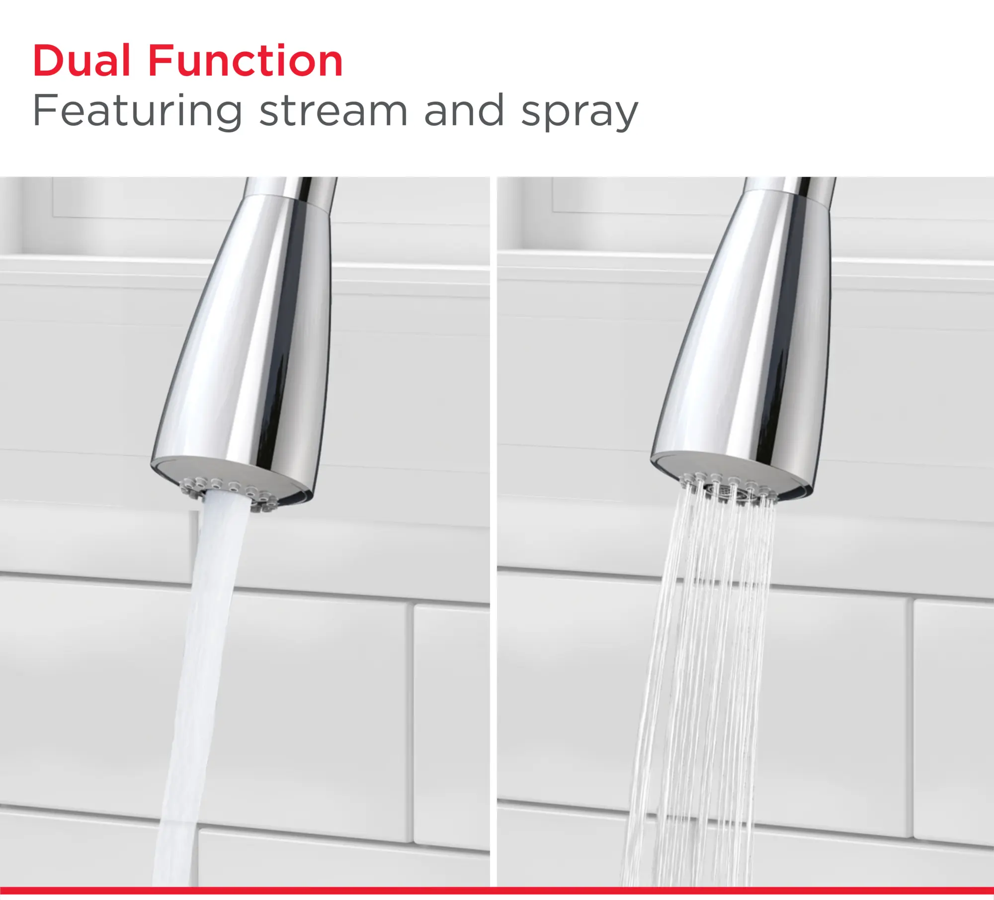 – Single-hole kitchen faucet with toggle on spray head to easily switch from regular stream to spray functions, and pause.